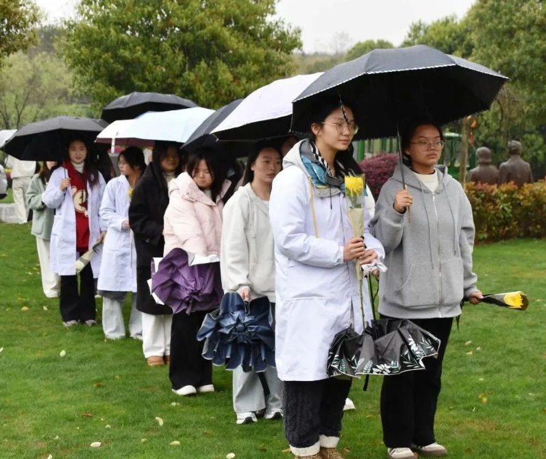 即使当天下着雨,学生们也都整齐列队,在夏征农先辈雕塑前肃立默哀,仔细聆听先辈的人生介绍,并敬献鲜花表达对这位教育家的深切缅怀。